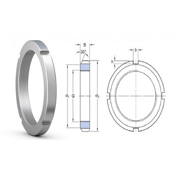 Hriadeľová matica KM sa najčastejšie používa na axiálne zaistenie náboja na hriadeli, axiálne zaistenie ložísk na hriadeli alebo na vytvorenie predpätia v kuželíkových ložiskách. Matica má po obvode zárezy, ktoré slúžia na montáž a utiahnutie matice pomocou hákového kľúča. Na zaistenie matice v zaskrutkovanej polohe sa používajú poistné podložky MB.